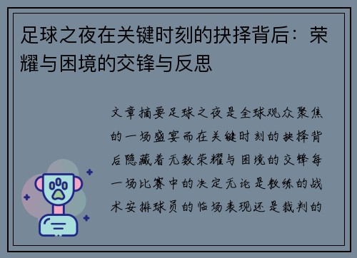 文章摘要:足球之夜2025盛大启幕,是一次集结了新生代足球新星的足球盛宴。这一赛事不仅展示了年轻球员们的技术与才华,也成为了各大俱乐部和国家队的选拔舞台。比赛中,新星球员们通过激烈的对抗,展示了他们超凡的竞技水平、对比赛的理解与未来的发展潜力。这一夜,不仅是足球爱好者的狂欢,更是年轻球员成名的机会。在各方期待下,足球之夜2025无疑成为了一次极具影响力和历史意义的体育盛事,为足球的未来注入了新的活...